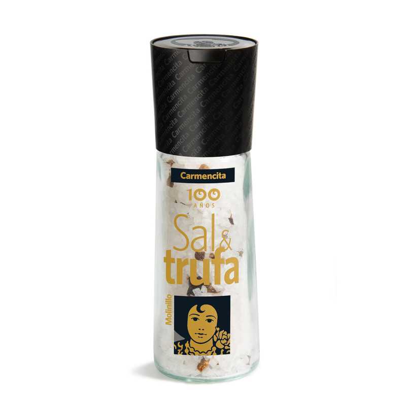 Moulin de 105 et 360 grs. de sel marin à la truffe (2%), une combinaison parfaite pour transformer n'importe quel plat en une authentique recette gastronomique, sélectionnée, fabriquée et emballée par Carmencita.
