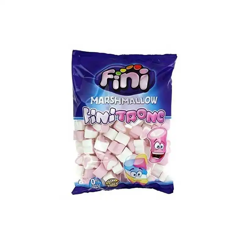 Sacchetto di spugne, schiume o nuvole a forma di cuore di sapore di fragola e colore rosa e bianco del marchio Fini. Senza glutine e senza grassi.