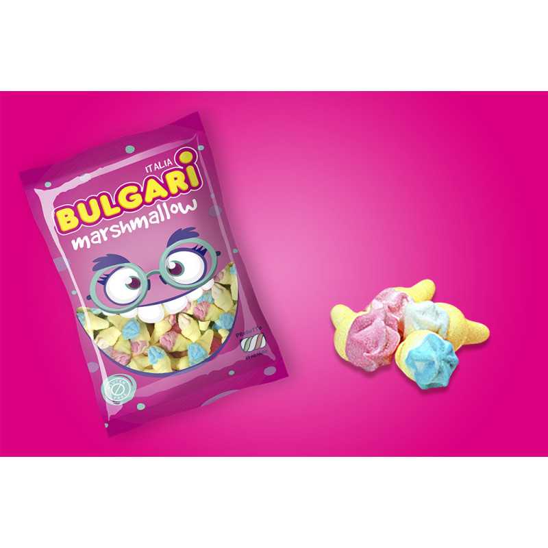 Mini gelati Bulgari – 900 g (circa 150 pezzi). Morbidi marshmallow a forma di mini gelato, nei colori bianco, blu, giallo e rosa. Dietro il loro aspetto colorato si nasconde un delicato sapore di vaniglia. Ideali per ravvivare tavole imbandite, spiedini o per gustarli in modo divertente e goloso.