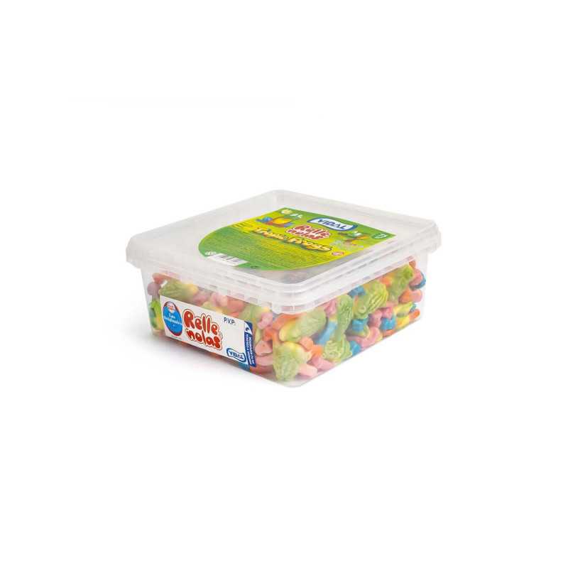 Caixa 65 gomas na forma de sapos de sabor tropical recheados e muito macios do fabricante Vidal. Sem glúten e sem gordura.